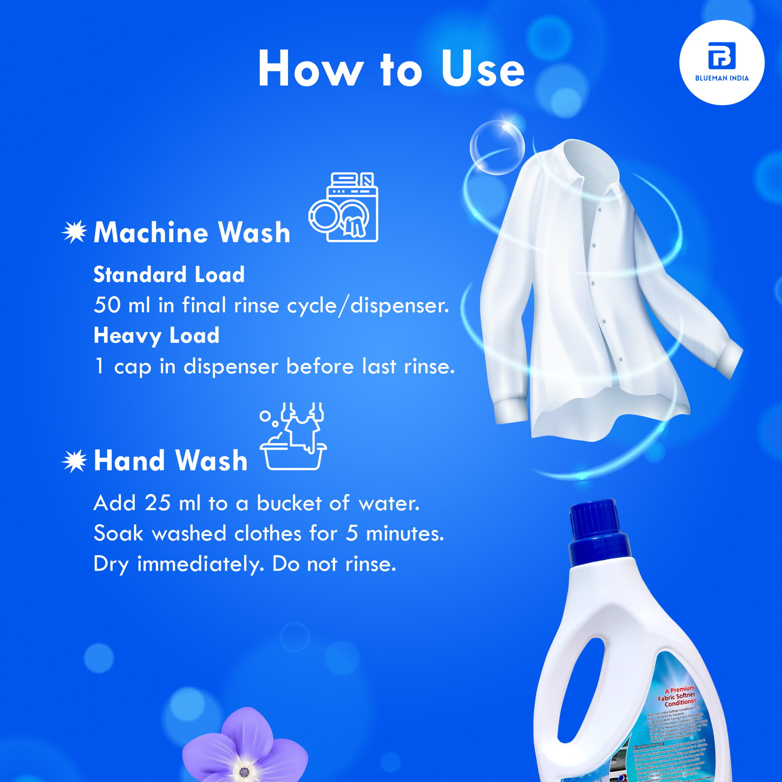 Direction to use: If you wash the clothes manually in bucket so pour 1/2 cap post the liquid and soak the clothes for 5 minutes. If you have semiautomatic washing machine so pour just 1 cap at the start of wash cycle in the post the liquid additives compartment. If you have fully automatic/top load washing machine so pour just 1 cap at the start of wash cycle in the post the liquid additives compartment OR directly in wash tub before the last rinse.